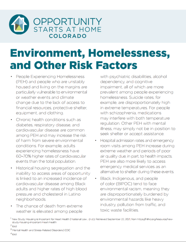 Housing alone will not protect against climate change, natural disasters, and extreme weather events, however, Colorado’s dearth of housing disproportionately puts PEH at risk of harm and even death. Policy interventions will become increasingly important moving forward.